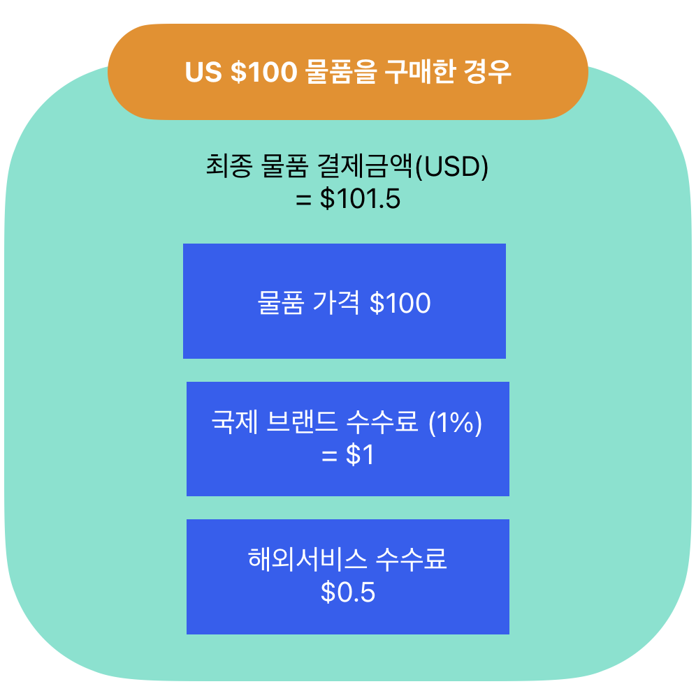 $101.5(물품 가격 $100 + 국제브랜드 수수료 $1 + 해외서비스 수수료 $0.5)